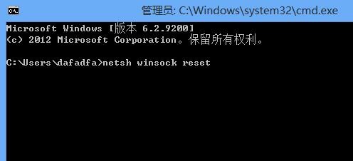 2、第二步:在窗口中,输入netsh winsock reset,回车即可。