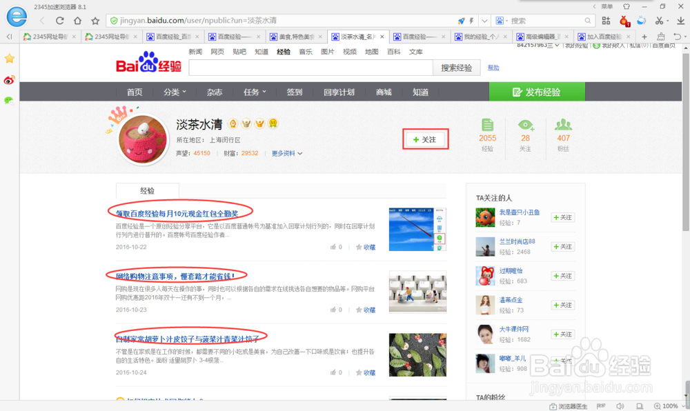 3、打开百度经验,关注一些知名写手,看看他们都写了什么