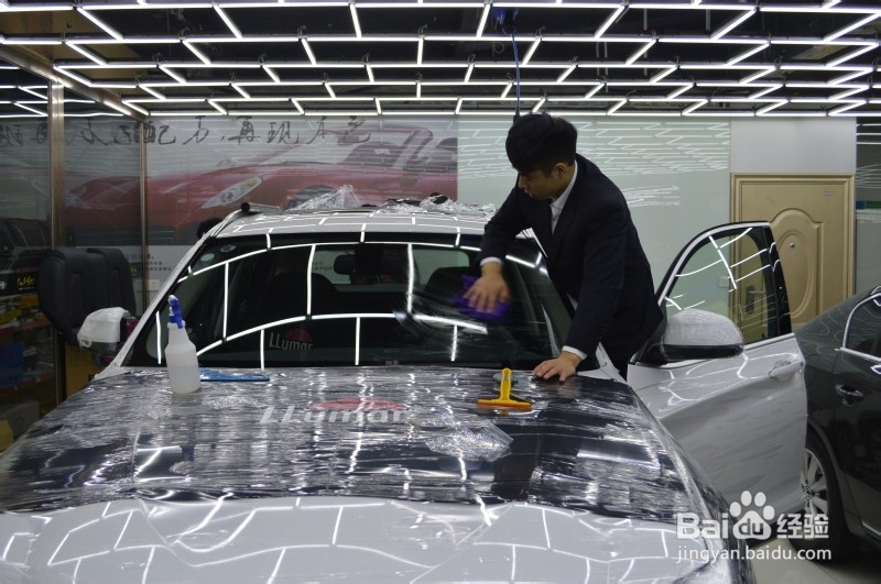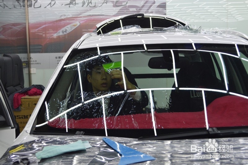7、在每片窗膜安定于它的最终位置后,应立即在窗膜表面再次喷洒安装液,润滑挤水的表面。之后用长三角塑料刮板进行赶水