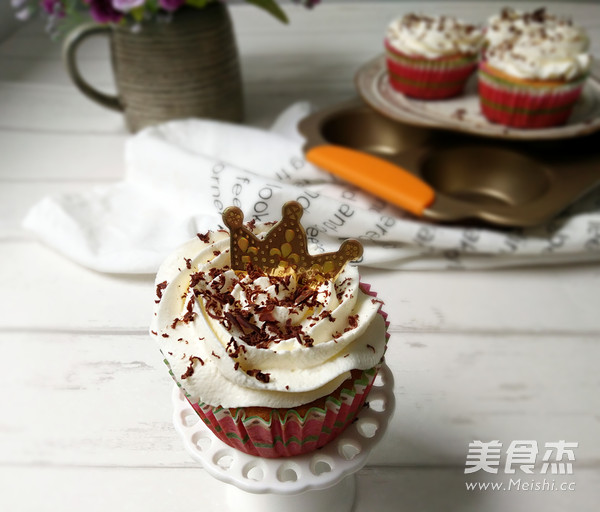 12、晾凉的杯子蛋糕上面用奶油裱花,撒些巧克力碎装饰。