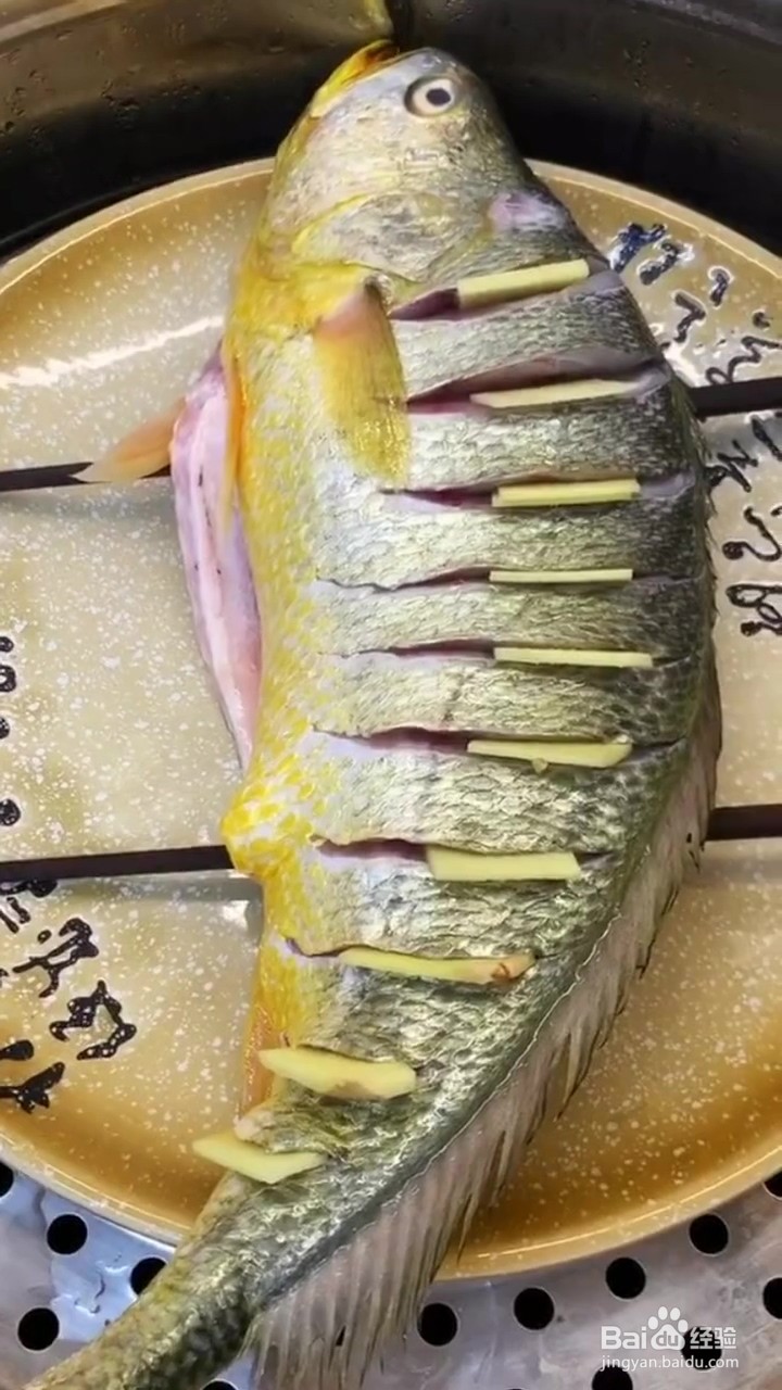 1、黄花鱼整理干净划刀 划刀口夹入姜片 放入锅上蒸