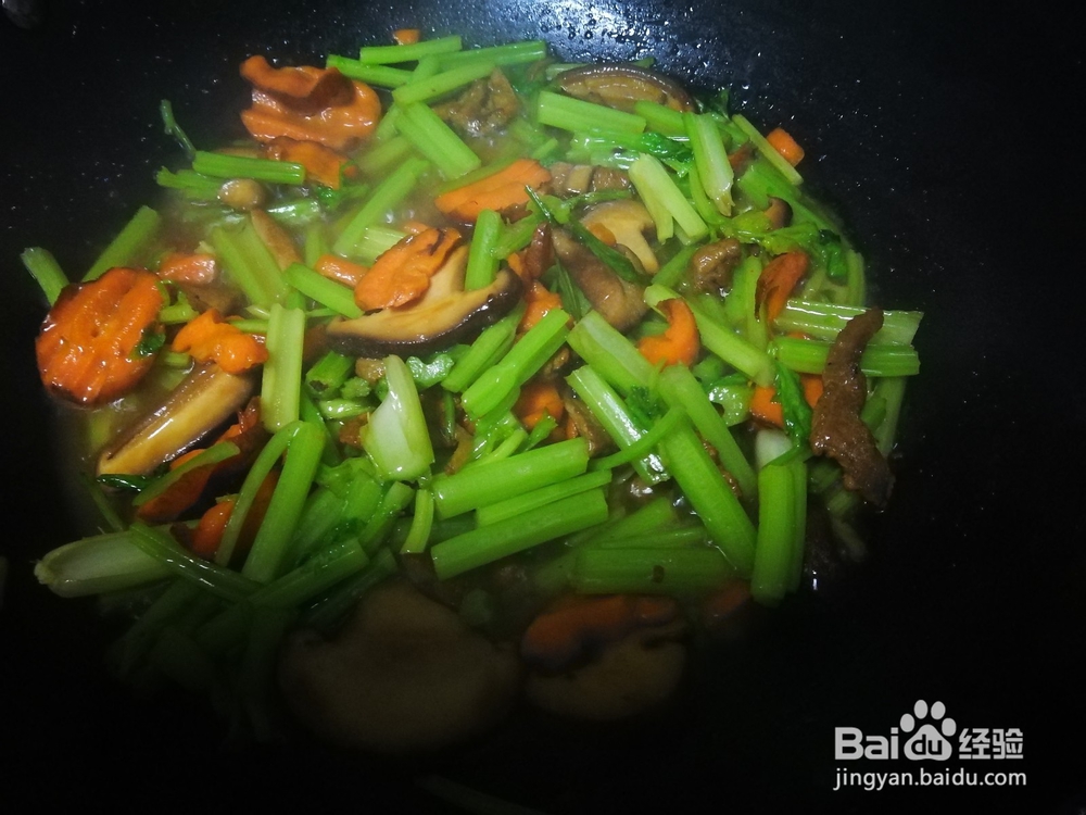 3、加入芹菜继续翻炒,加入香菇炒匀,直至炒熟。加入适量食盐调味。出锅。