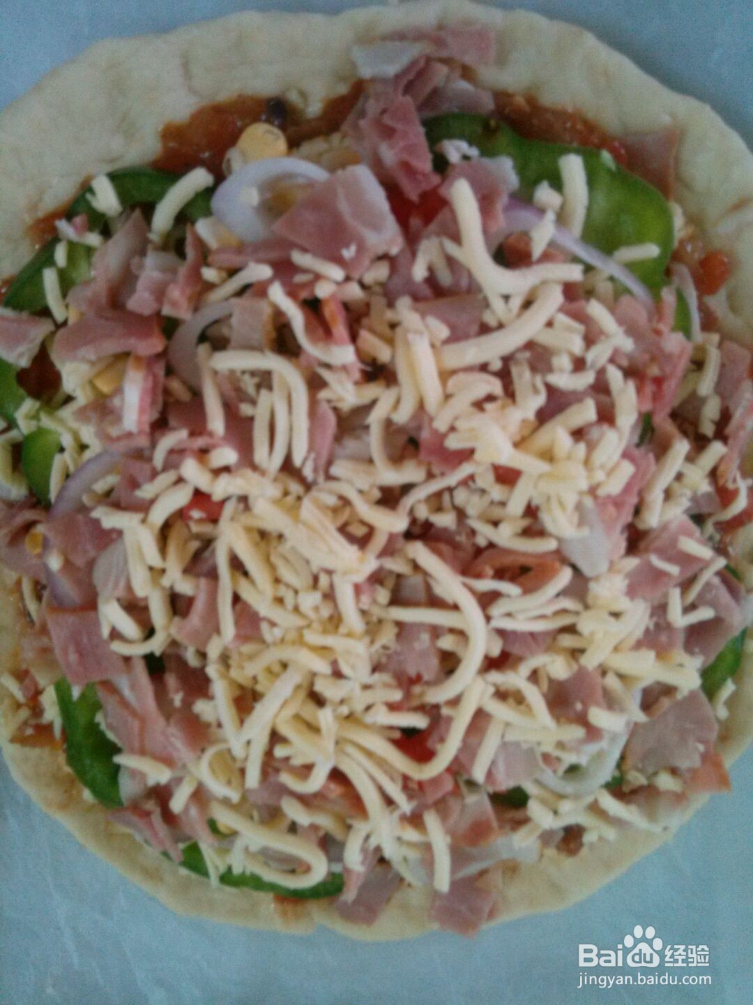 10、放入青椒,玉米,洋葱,西红柿。再放入一层马苏里拉
