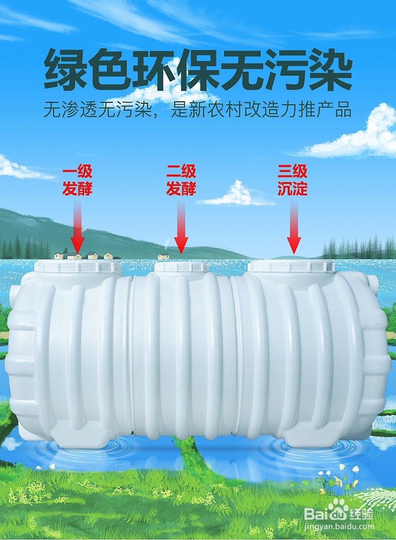 3、发防沉降结构设计,有效控制沉降过大造成的罐体变形及渗漏,不污染地下水资源,环保节能结构巩固,防腐耐用、安装便捷。采用温水处理技术,每次冲测用水0.35升。污水环流式流动设计,污水处理能力高于传统同类化粪池两倍以上,经过三格发酵处理出来的水是无污染的,可排到:污水管、农田、菜田、水沟。实现了粪渣资源可再生利用,成肥还田,提升了百姓人均生活质量的同时,保护了生态环境。