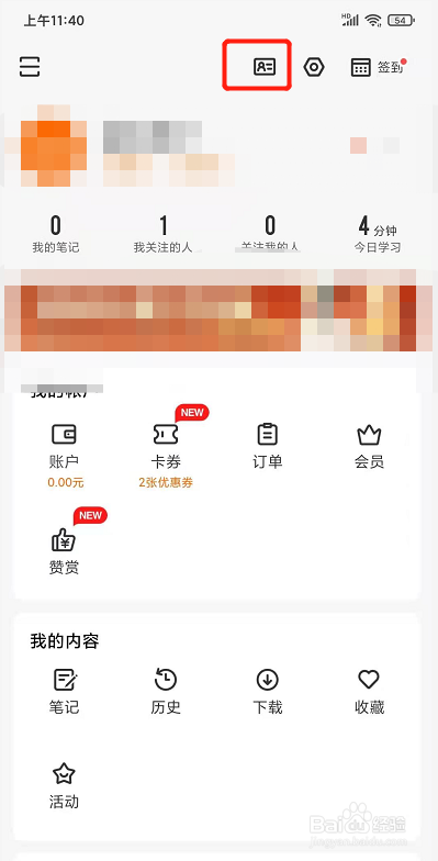 3、然后我们进入到个人中心界面,我们点击右上角的【获取学生证】,位置如下图所示: