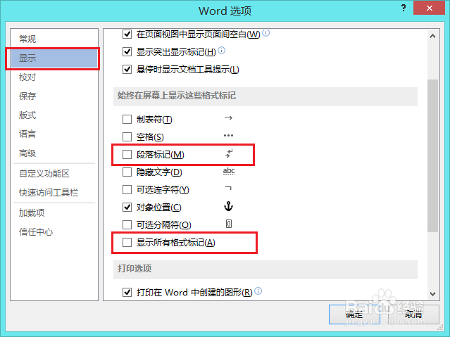 3、点击“显示”,取消“段落标记”和“显示所有格式标记”的勾选。