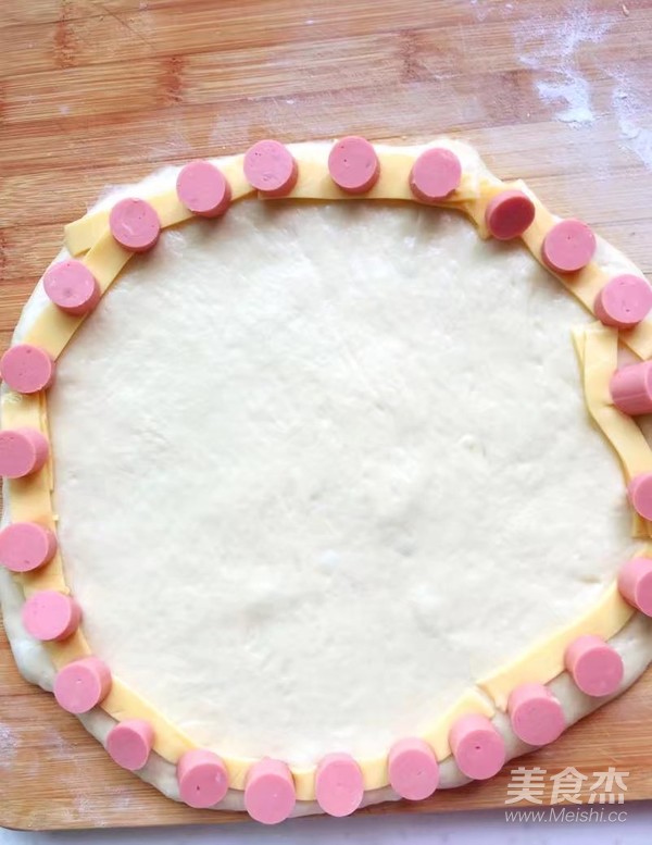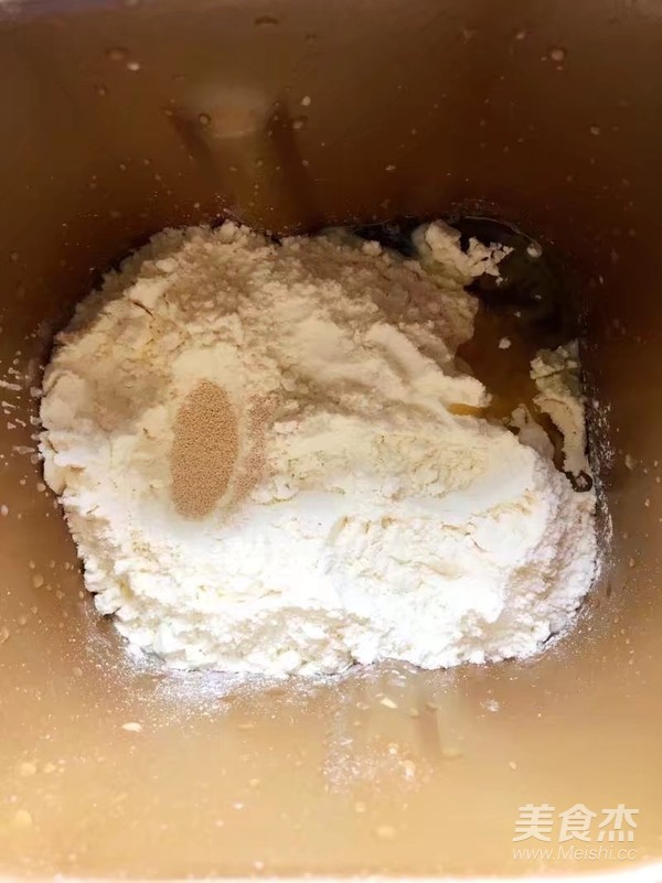 1、面包桶中倒入水和玉米油,打入鸡蛋,一角放糖,一角放盐,倒入面粉,在面粉上挖个小坑,放入酵母,开启和面程序20分钟,和成面团