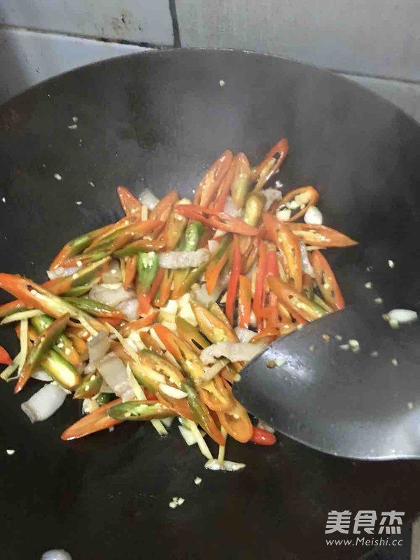 2、放入少许油、肥肉 先煎一会肥肉出油 放入蒜蓉 姜丝 翻炒2炒 放入辣椒,加适量的盐 炒到辣椒变色 微软