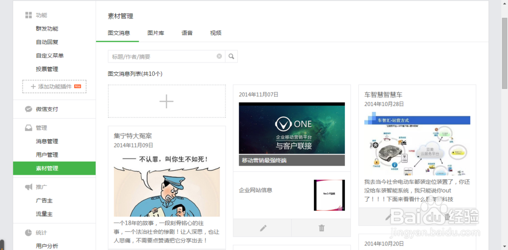13、这里是素材管理,这里可以编辑图文信息,语音,和视频的上传,可以创建多图文信息和单图文信息,素材库内的文件可以任意插入编辑的对话框中