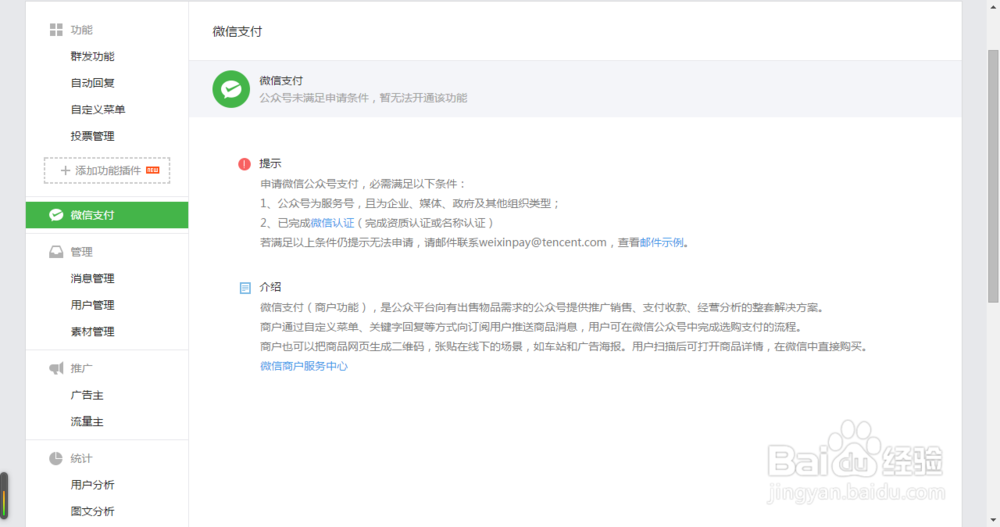 10、这里是微信网上支付的认证,需要先认证才可以开通,认证的详细流程后面会讲道,开通过程需要添加对公账户,会打款确认,当然有行业限制,某些支付行业是不能通过的