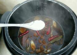 11、如图加入末过牛肉的热水,放入适量的盐,盖上锅盖插上电源启动电源时间调50分钟即可,煮好后电压力锅自动跳闸,等高压阀排气完以后就能打开锅盖将锅里的所有调料挑选出来,随后装盘即可开动。