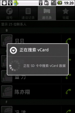 8、选择完以后,系统会自动开始扫描您手机内存卡中的vcf名片备份文件,稍等片刻,扫描结束后会自动开始导入名片,瞬间的功夫,以前手机上的联系人就全部导入到Android手机里了!
