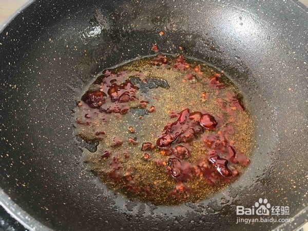 3、锅中放油烧热,加一勺红油豆瓣酱炒出红油