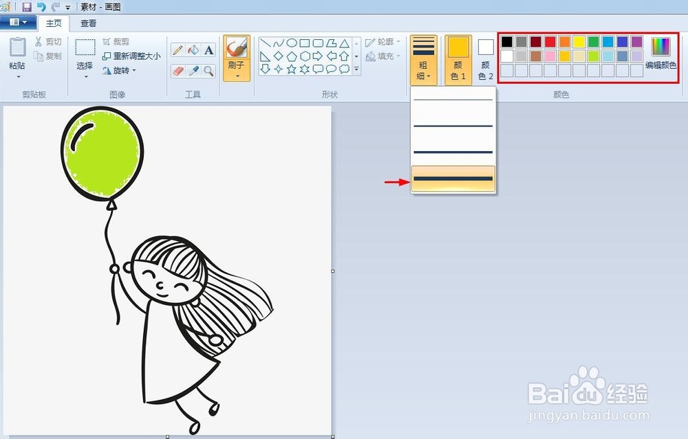 2、第二步:在颜色板中选择要填充的颜色,将刷子设置成合适的粗细。