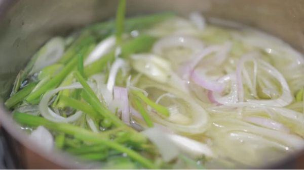 3、将以上材料放入油中熬至金黄,制成葱油。