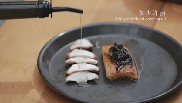 7、将切片的香菇一同放入烤盘,加少许油。