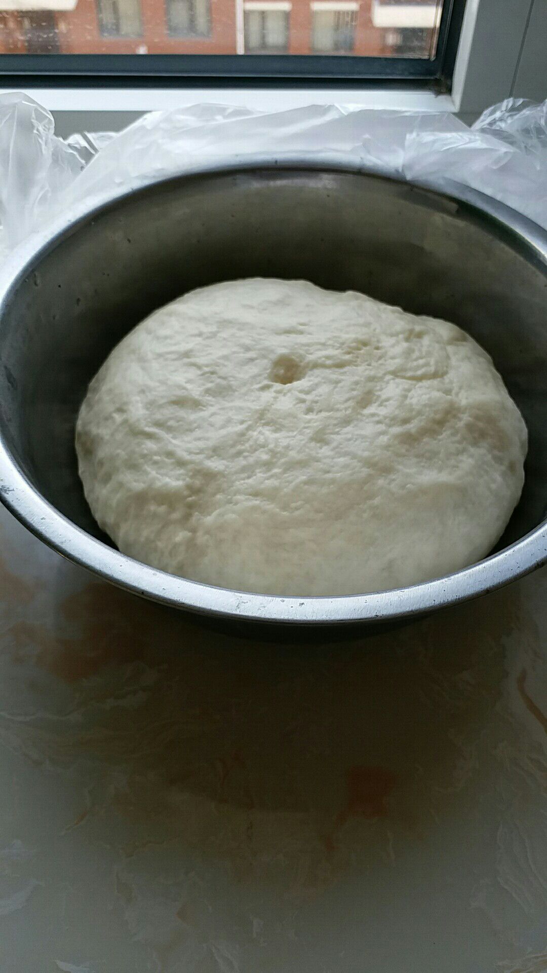 1、将高筋面粉,低筋面粉,盐,糖,酵母,温水,混合在一起和面。 黄油我用的是单独小包装的,放在温水里化一下。不会和面的最简单的办法就是把面往里揉(可以百度一下)。和的差不多的时候加黄油,接着揉。将面团放于
