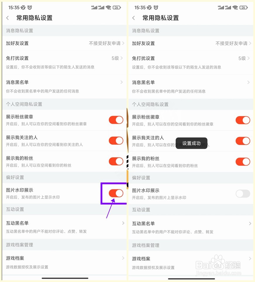 4、在常用隐私设置页面。关闭偏好设置下的【图片水印展示】开关即可。
