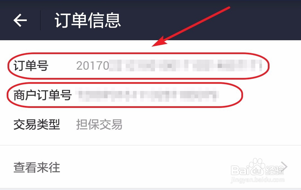 4、打开之后我们就能看到该交易的「订单号」和「商户单号」,一般长按就能复制「订单号」,如果不能复制就只好手打了