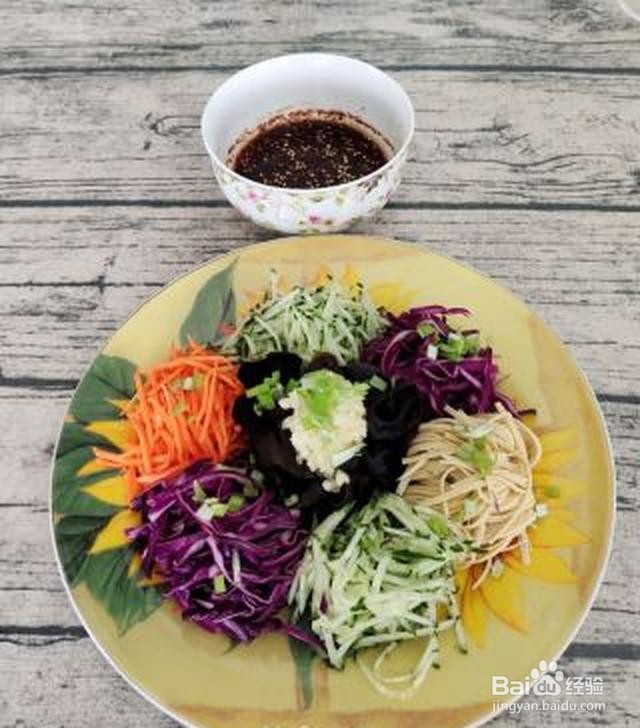 2、将蔬菜切成丝摆放四周,黑木耳放中间。