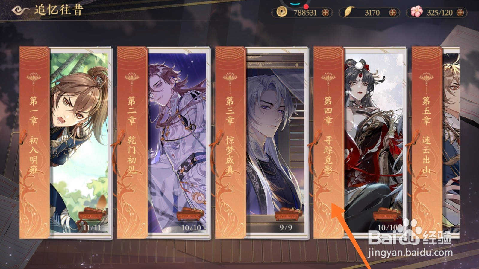 3、在打开的追忆往昔页面,然后点击第四章:寻踪觅影。