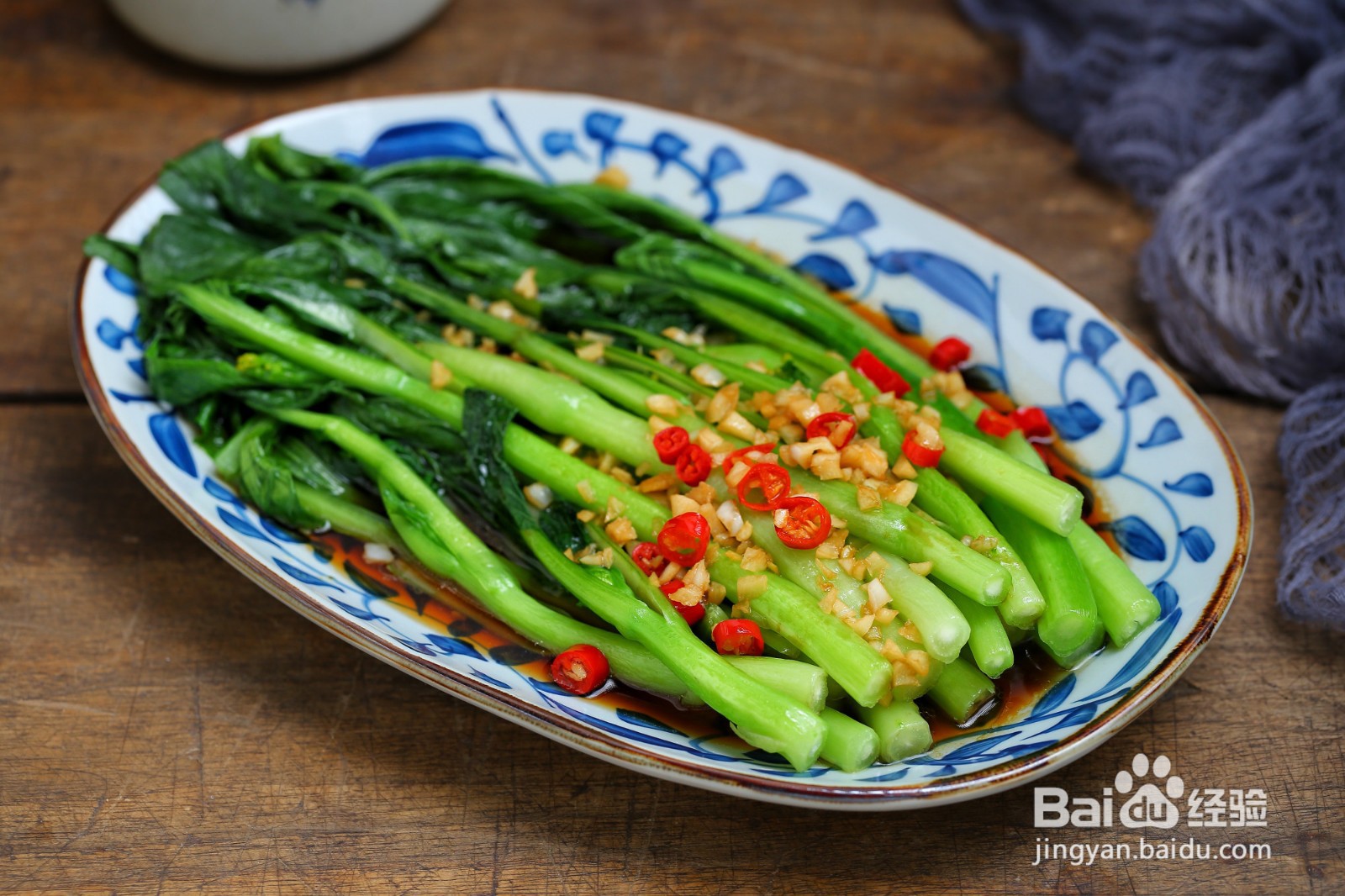 5、准备一个长形盘子,把菜心捞出来沥干水分摆放盘中。