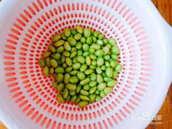 2、将毛豆洗净沥干。(毛豆剥好以后,要把表面的那层白膜捻掉)