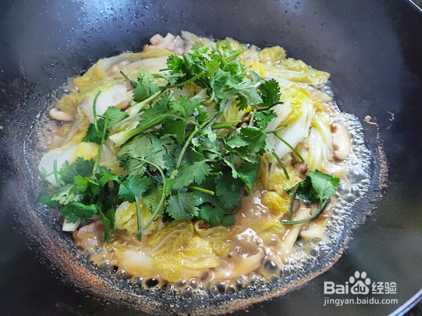 9、开盖,看到娃娃菜炖得软烂了,尝下咸淡,根据自己的口味加适量盐。撒入香菜。