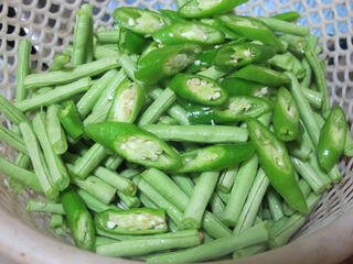 1、将青辣椒切成小块,与择好洗净的豆角放在一起