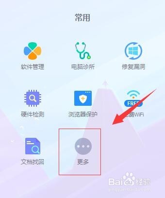 1、首先,打开360安全卫士,在右下角找到小工具的更多选项。如图: