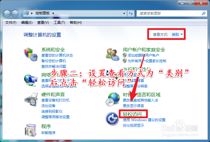 2、打开系统控制面板界面以后。将查看方式修改为“类型”,然后在点击功能界面最下方的“轻松访问”功能。