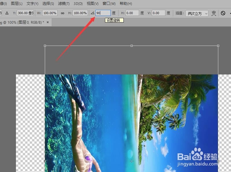 3、按Ctrl+T组合键,调出变换控制框,在属性栏中设置旋转为‘90’度,按Enter键确认旋转。