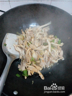 7、倒入平菇,翻炒;把剩余的葱段葱白倒进去;