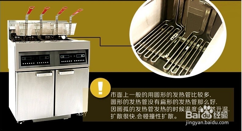 2、那这个炸炉的另一个优质之处就是,它的发热管。有的人肯定不知道,发热管是什么,因为这款炸炉是电磁式的,所以它的发热管的发热是通过电压功率提供的。言归正传,这个发热管怎么好呢,市面上一些知名店铺现在用的还是一种圆形的发热管,而这个,是U型的扁型发热管,它比市面上的圆形发热管升温更快,即当油温往上升的时候,能产生足够的热量,使得油温更耐用,油质更好,油的使用寿命更长。现在,我的老板都叫我不用一天换一次油了,如果是起酥油,三天换一次都可以。