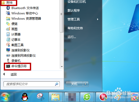 1、第一个方法需要使用到命令提示符,点击电脑左下角的开始图标,在所有程序的【附件】里找到【命令提示符】并鼠标右击。
