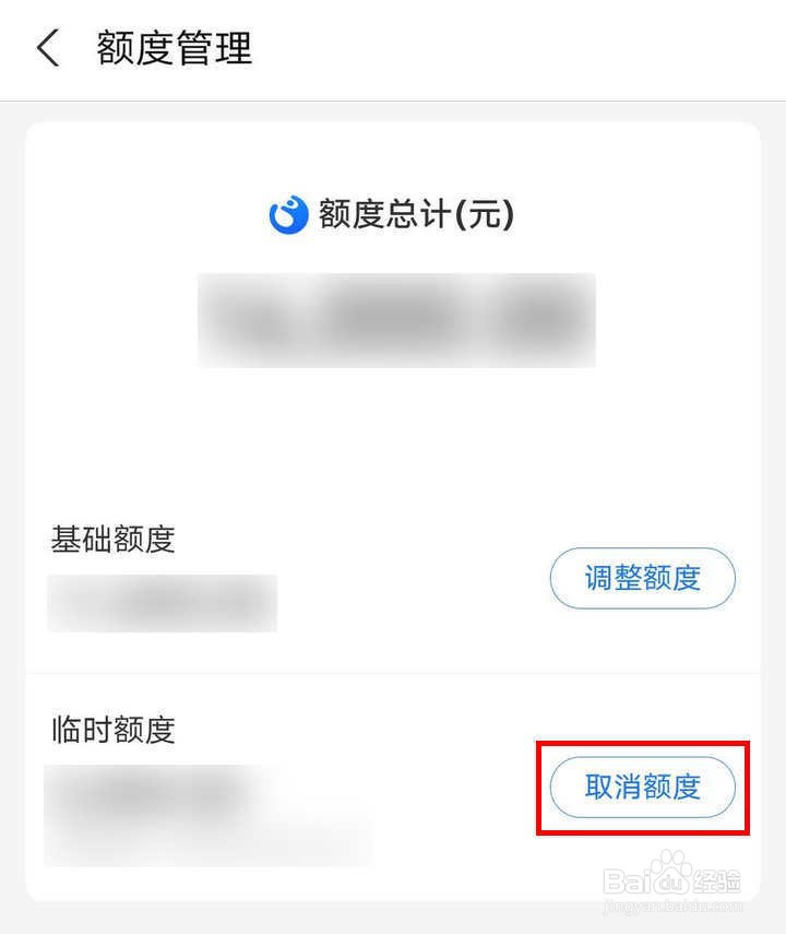 5、额度分为基础额度和临时额度,基础额度只能做调整,临时额度是可以取消的,点击取消额度;