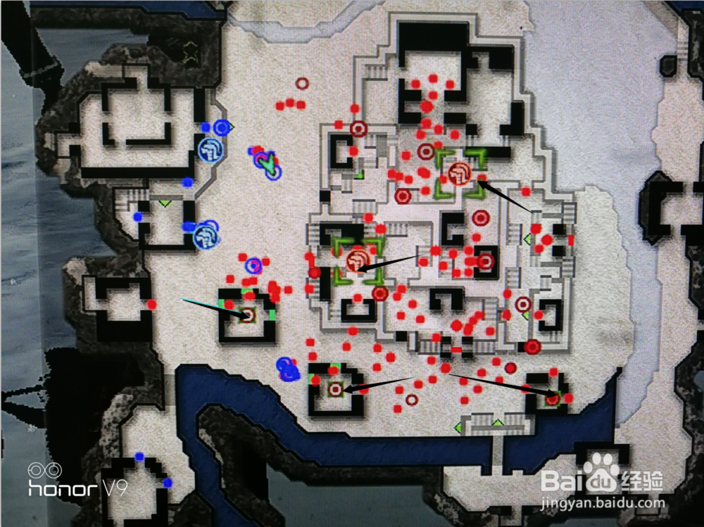 2、进入出现在高台处,直接从高处跳下,进攻下图箭头所标的五个点,第一步进攻外围的三个点,触发安装投石车任务。