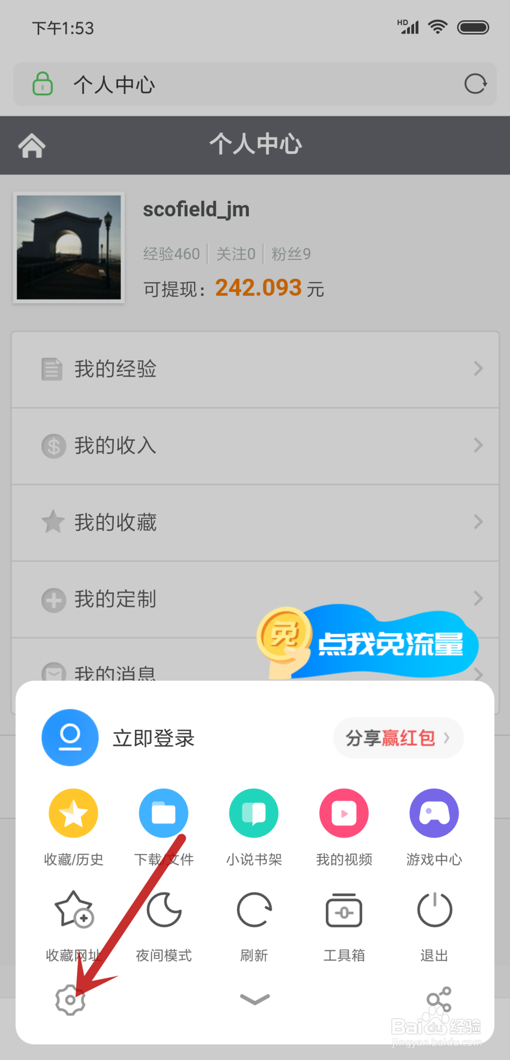 1、打开手机上的浏览器,小编这里以“UC浏览器” 为例 ,输入百度网址,并登录,进入百度经验,出现的是下图的界面,点击进入“个人中心”(图中红色箭头所指)