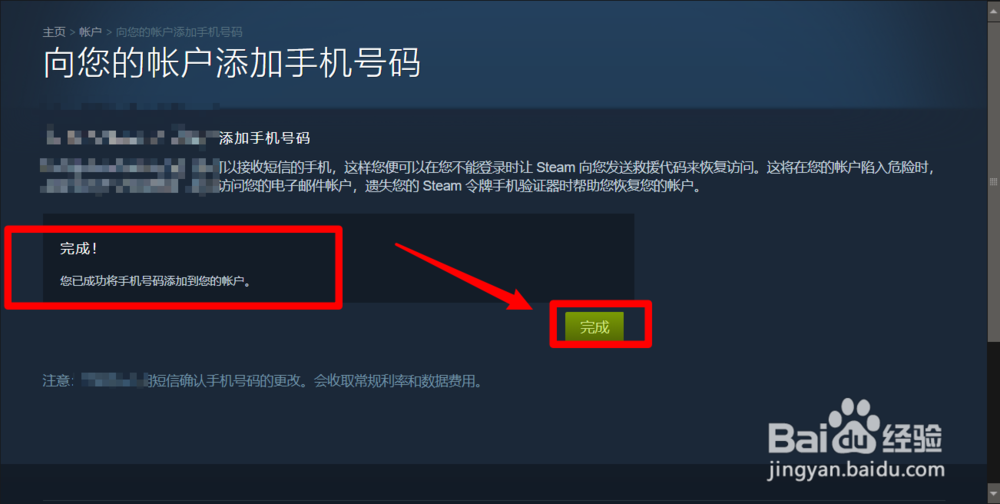 7、之后,我们就可以看到提示您已成功将手机号码添加到宁的账户,然后点击完成即可,如图所示。