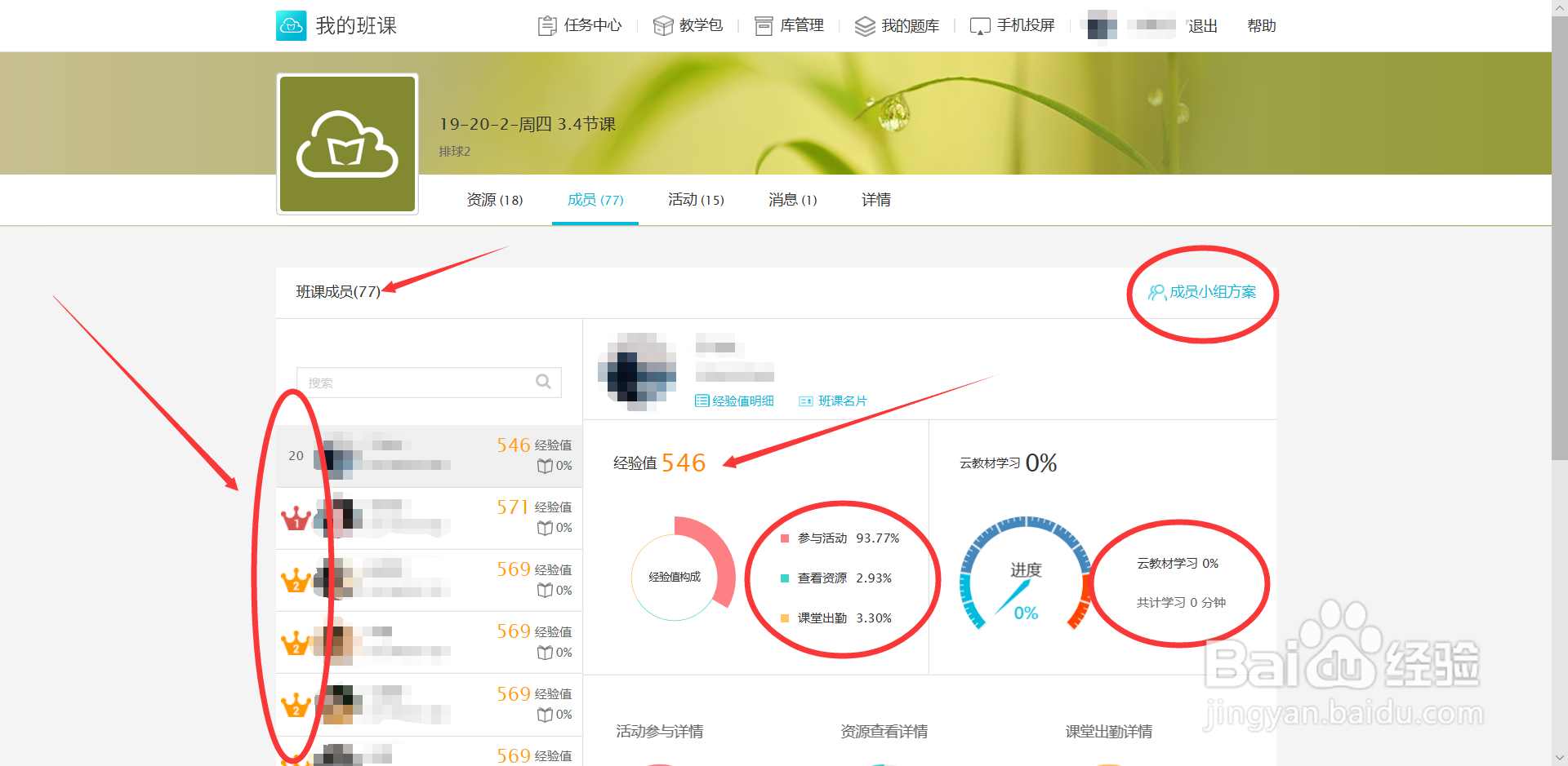 5、在成员这里可以看到自己在班课中的排名,以及自己的经验值和是通过什么来得到的经验值,在这里展示的都非常详细,这个经验值是通过任课教师根据学生平时的表现情况进行发放的,以排名来督促同学们的学习。