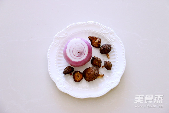 3、香菇用清水泡开后充分洗净,切成条状;洋葱切成小粒