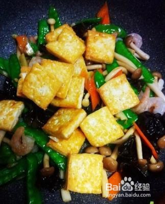 8、拌匀调味品后加入煎好的豆腐,翻炒几下转小火,加入少许水淀粉勾芡出锅。