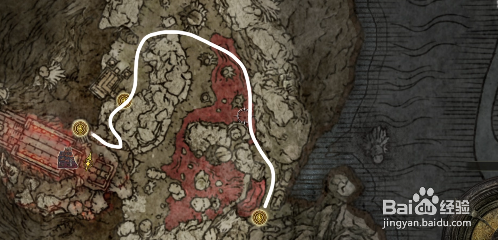 2、位置二:击败鲜血贵族进入通道,按照图示位置到达地点,就能获得第二块;