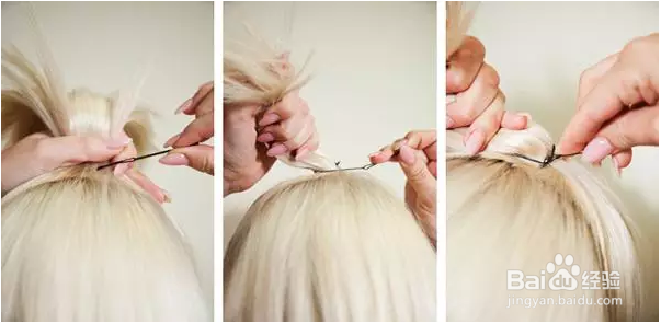 2、梳起前额三分之一的头发,在发顶处扎起一个坚实的马尾辫,以另一条小皮筋B固定。用梳子梳理马尾,并将辫子的发量一分为二。