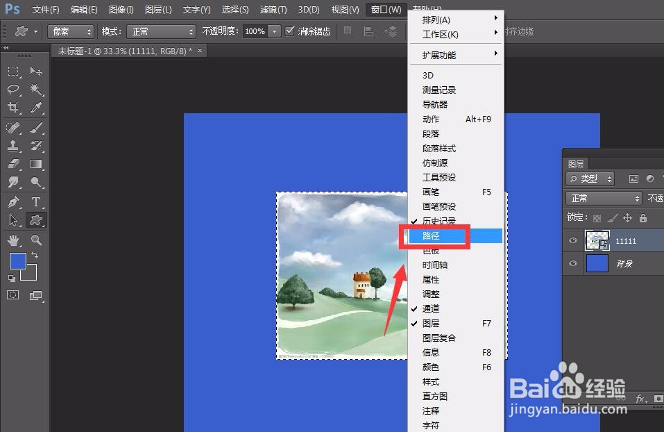 5、下面,我们点击菜单栏的【窗口】——【路径】,点击路径面板右下角的将选区转化为路径的图标,如下图所示。