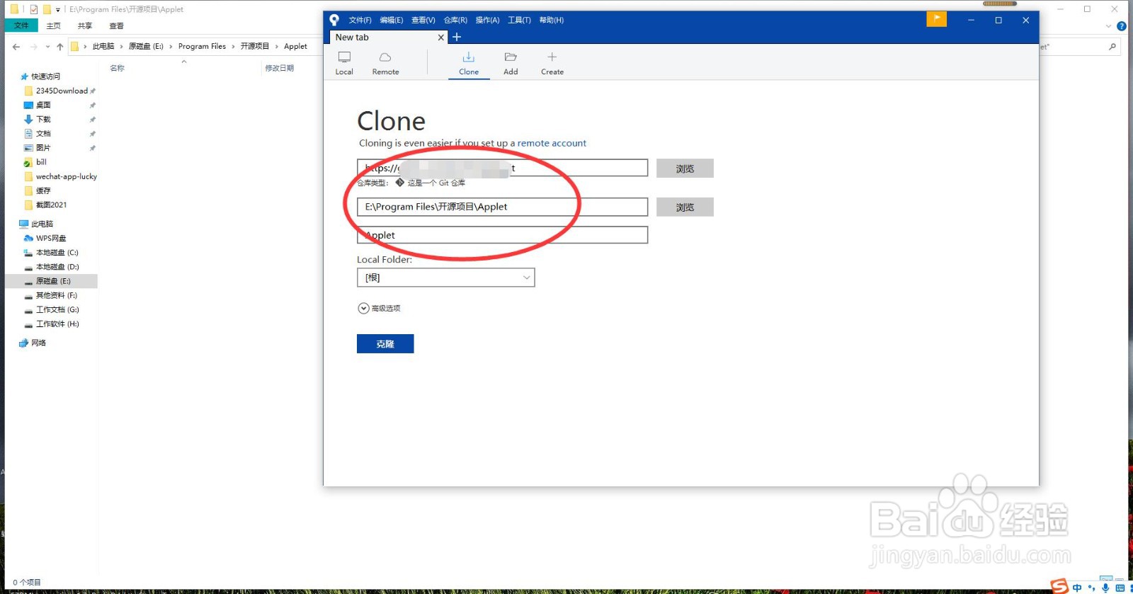 3、接着填写之前在码云创建的项目地址并选择克隆存放位置。完成后点击克隆。
