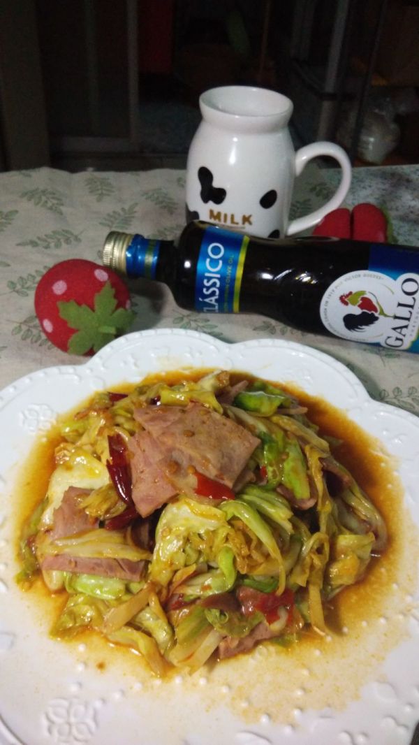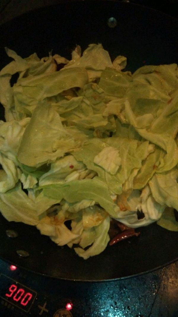 6、倒入包菜,翻炒,放入一勺料酒,两勺生抽。