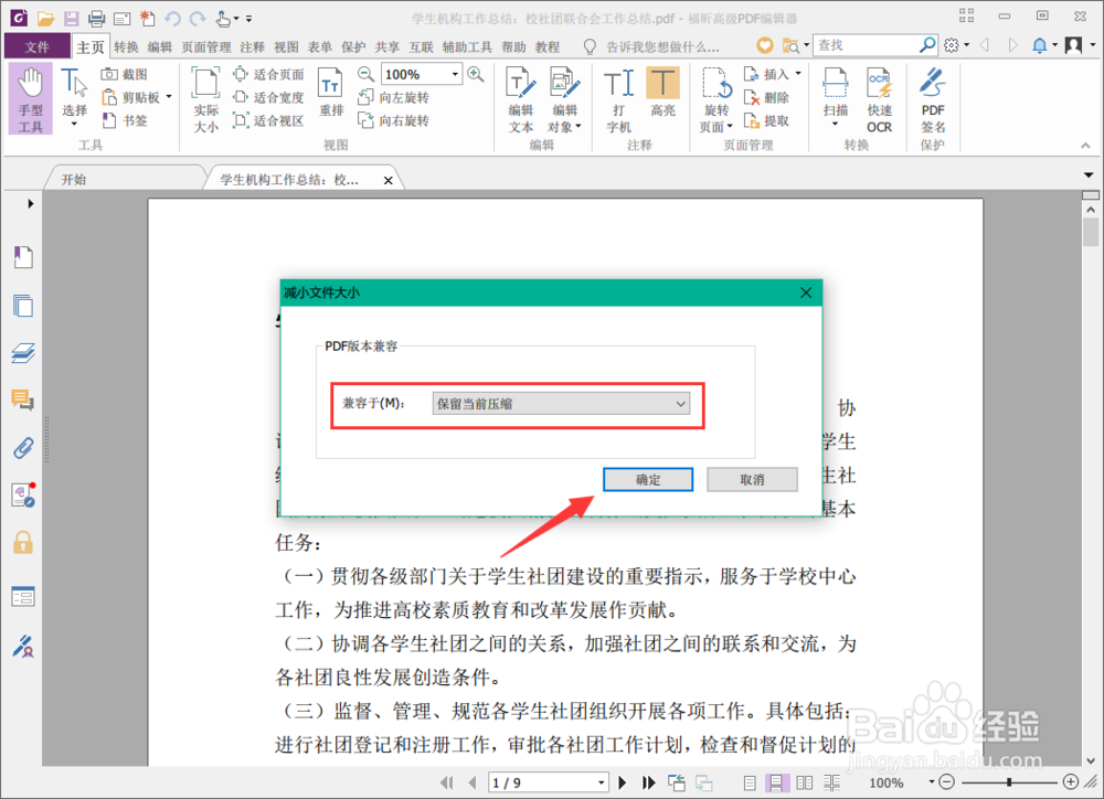 3、在弹出的“减小文件大小”对话窗中选择PDF版本兼容,默认是兼容于保留当前压缩,大家可以根据自己的实际需求进行选择,之后点击“确定”;