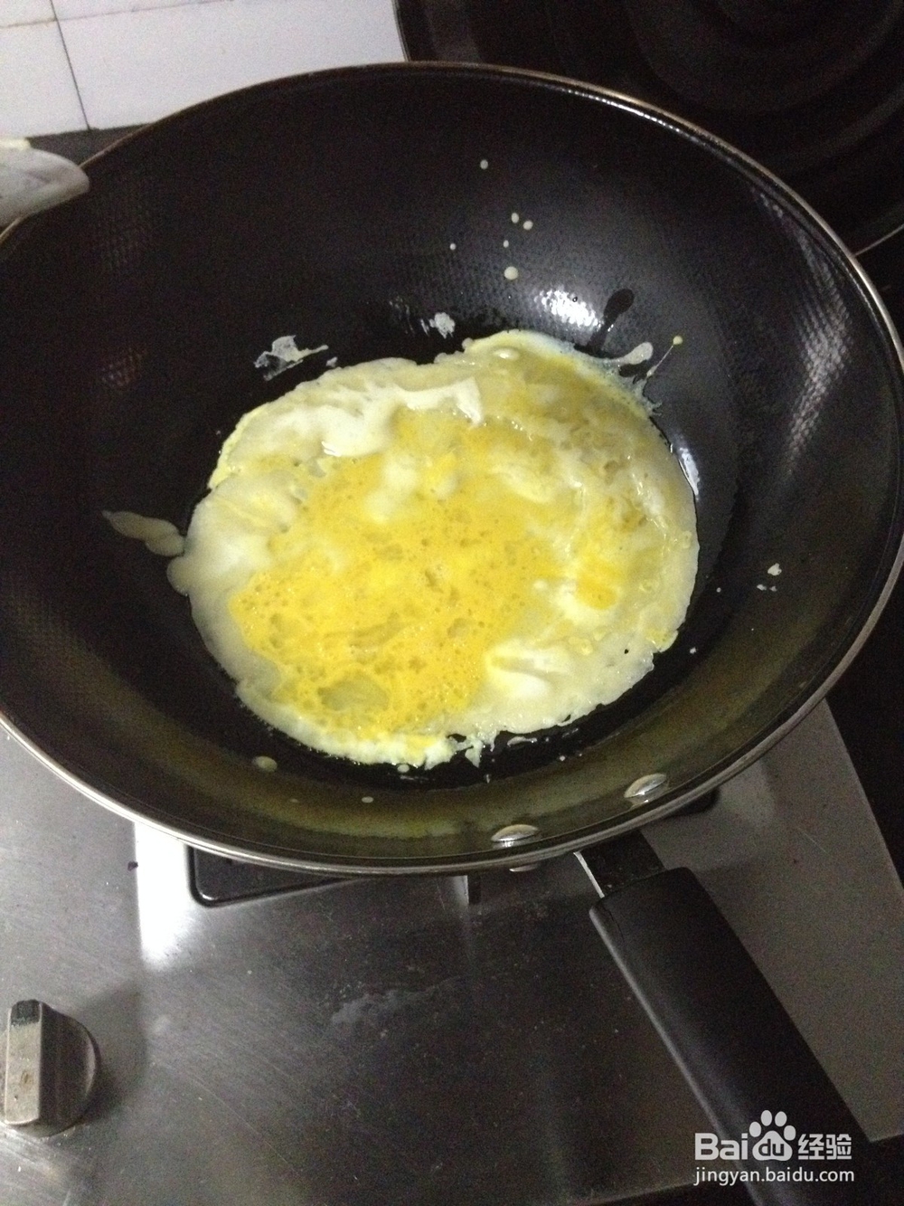 4、 待面饼稍微定型之后,把蛋液均匀的倒在面饼的表面,然后用铲子慢慢的移动面饼,使其与锅底分离。(如果有小葱,还可以在上面撒上葱花)。