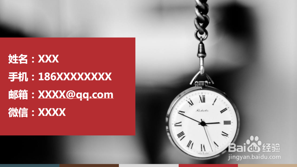 3、个人信息展示,如果演示完之后,后续可能需要别人联系你咨询,可以在结束页放上自己的个人信息联系方式,以便听众可以找到你